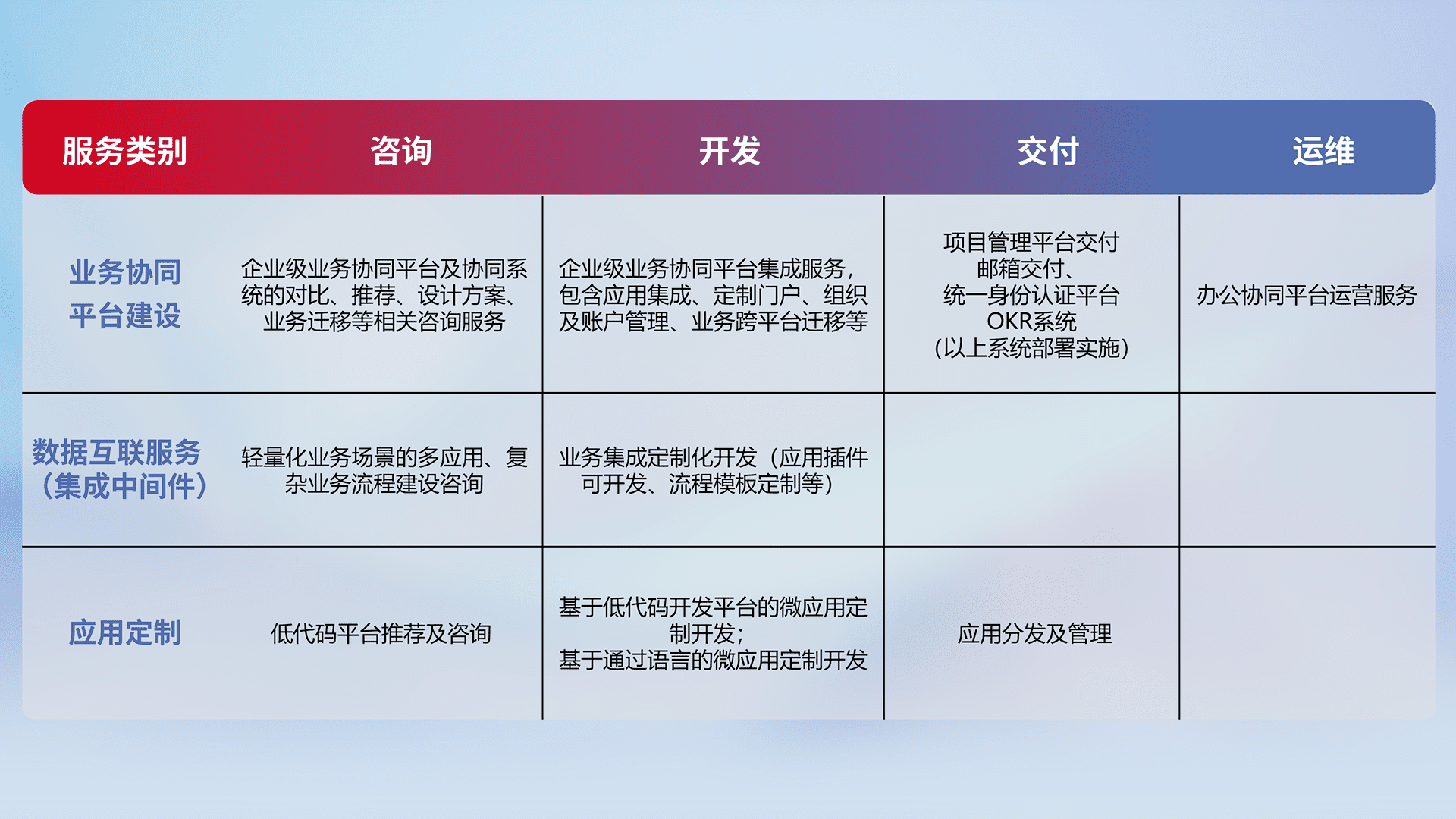 针对钉钉、、企微、、、、IDaas等平台级产品提供产品的规划、、方案、、、交付、、、定制化开发等服务,,,实现如统一协同办公、、、智能客户服务、、、、混合会议管理、、、、智能数据查询、、等业务场景,,实现数字化转型。。。