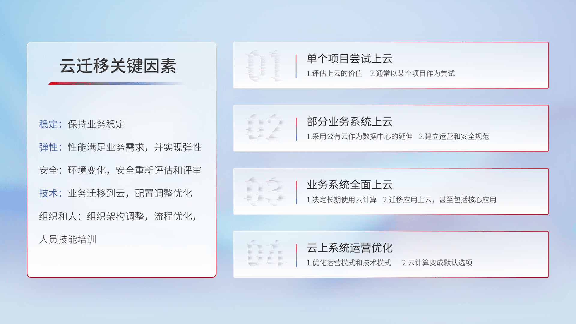 结合实际业务,,,,从规划设计、、云平台选型、、云原生改造、、、、数据迁移、、、、集成交付,,迁移全过程为客户识别最佳上云路径,,,,做好风险识别管理,,设计网络架构、、、、身份权限、、、安全审计合规、、、操作审计、、日志审计、、、监控告警策略、、、、多站点容灾设计等,,对云上基础设施进行整体规划,,,,提升IT治理水平,,以满足弹性、、、高可用、、高性能的需求。。