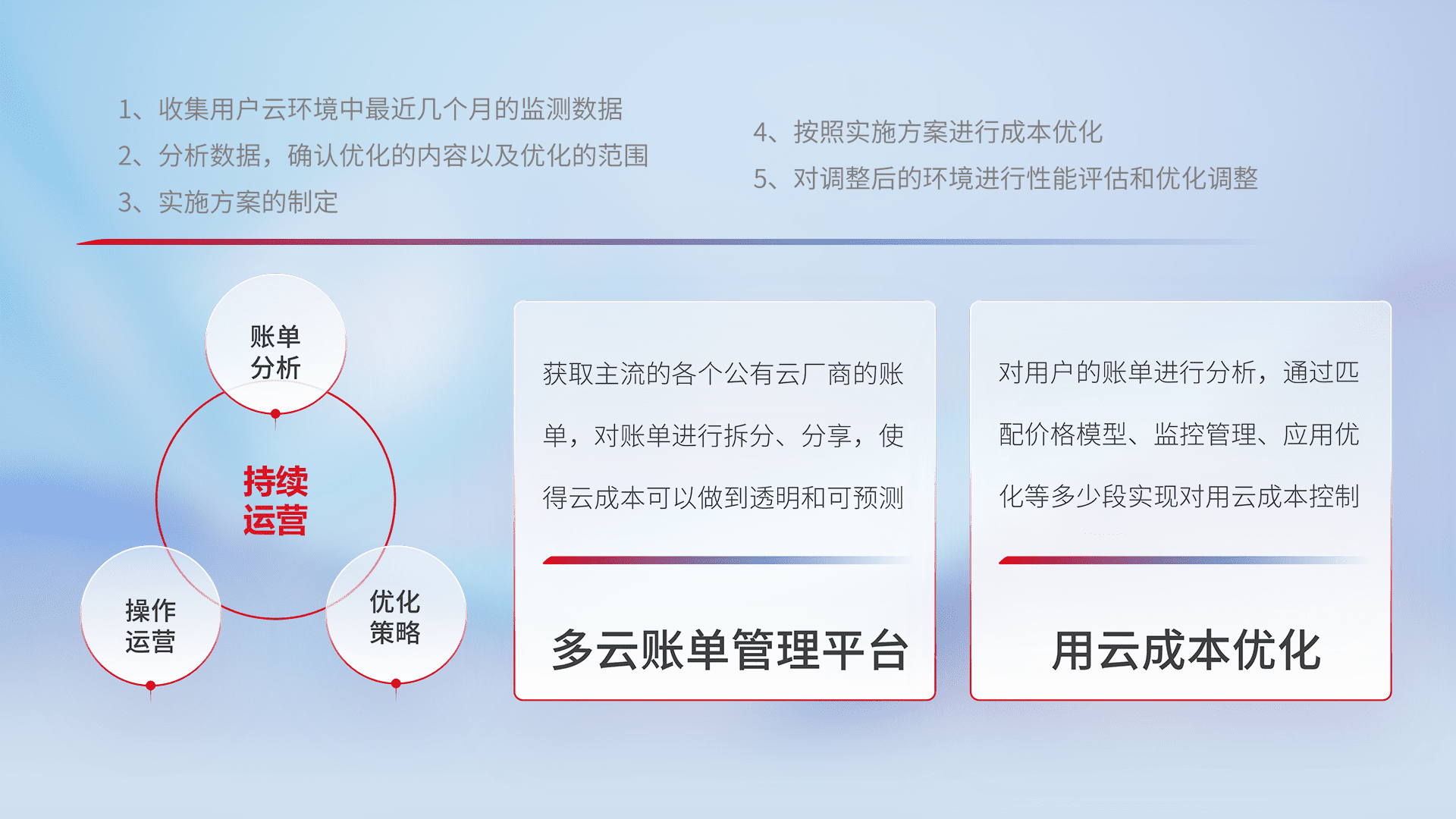 通过多云纳管,,,以统一的资源数据模型把客户的云资源进行抽象和封装,,,进而实现对多云资源的统一操作,,保障云资源管理的可靠性、、、、稳定性与可用性。。量身定制化运维内容,,,,配置、、开发运维、、补丁管理、、、、备份、、、、监控、、认证和访问管理、、审计和日常巡检等,,,,保障在用云过程中的可靠度,,稳定度以及高可用率。。。。